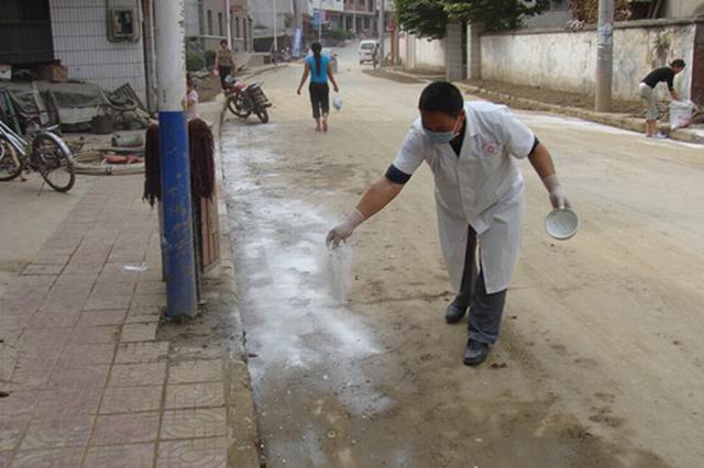 “小李,你这放在地上的面粉不能再吃了,这两天必须暂停营业,等全面消毒后再重新营业。”甘溪镇在洪灾过后,迅速组织干部和镇中心卫生院的工作人员一道,对受灾区域挨家挨户展开消毒工作并对灾后安全生产生活进行现场指导。