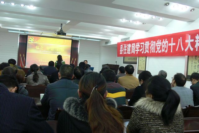 11月20日下午,县住建局召开专题会议,集中学习贯彻党的十八大精神,会议邀请县委党校高级讲师刘副斌作专题辅导。县住建局领导班子成员、机关全体干部及局属企事业单位共60余人参加了学习会议。