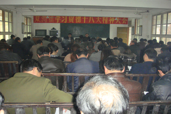 11月21日,双河镇组织全体镇干部及村三职共126名干部认真学习了党的十八大精神。会上镇党委政府结合当前重点工作,立足镇情,精心部署,要求全体干部做到“五个一”、搞好“四个结合”和实现“三个新”,迅速在全镇掀起学习贯彻党的十八大精神热潮。