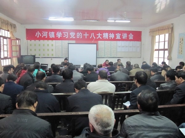 在小河镇,县委党校讲师陈守军从深刻理解十八大鲜明主题和重大意义,紧扣“创新”二字准确把握十八大报告创新理论的新论断和推进改革新举措,以全面建设小康社会为要义认真做好十八大精神的贯彻落实三个方面详细讲解了十八大报告的基本框架、主要内容和重要任务,对十八大报告提出的新思想新观点新论断作了深入、系统、全面的解读。
