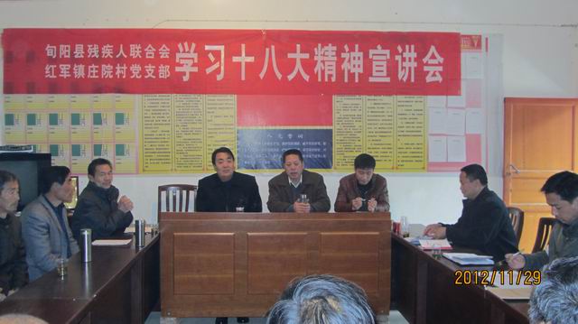 11月29日,旬阳县残疾人联合会深入红军镇庄院村宣讲十八大精神,并为该村的贫困党员们送去了棉被、毛毯等慰问品。