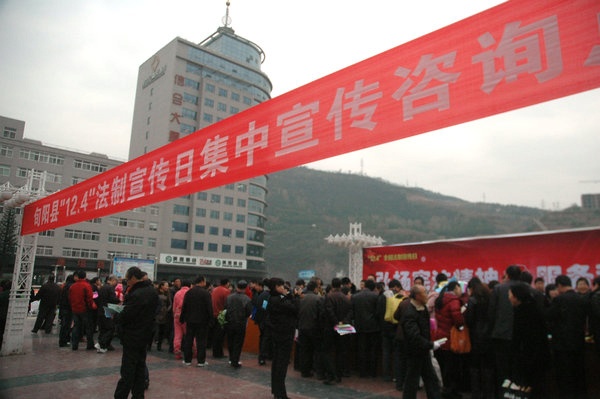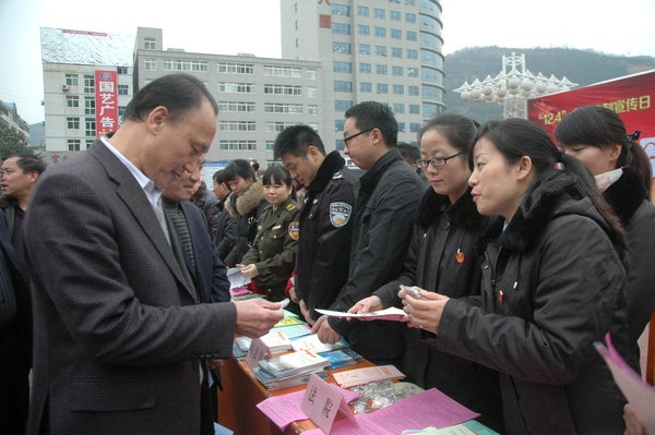 12月4日,旬阳县在祝尔慷广场举行全国法制宣传日集中宣传和法律咨询活动,县上领导陈刚、杨纪元、邹伟、朱远胜、程和新、孙自清出席活动。