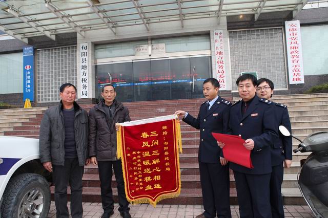 12月11日,旬阳县小河镇棋盘村村干部从百里外的山村赶到旬阳地税,将一面凝聚着全村286户1056人感激之情的大红锦旗和感谢信送到该局领导手中,真心感谢地税“三问三解心连心,春风温暖送棋盘”的为民情怀。