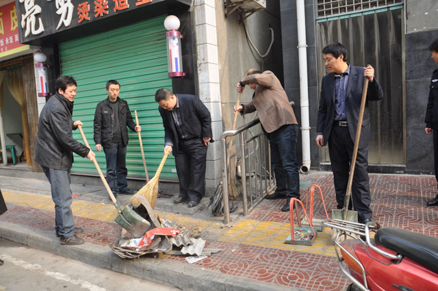 参加大清扫的干部职工手持扫帚、铁锹等工具,在卫生责任区域,认真将白色垃圾、果皮纸屑、垃圾死角及“牛皮癣”野广告进行清理。积极配合执法人员久违,并督促做好片区内流动摊点、占道出店经营、车辆乱停乱放等整治工作。