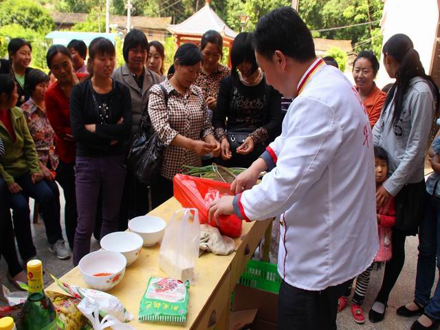 5月11日上午,甘溪镇政府的干部们买好蔬菜请好师傅,在该镇社区广场组织举办了为期三天的烹饪培训,使村民足不出户就能学到技能,得到实惠。