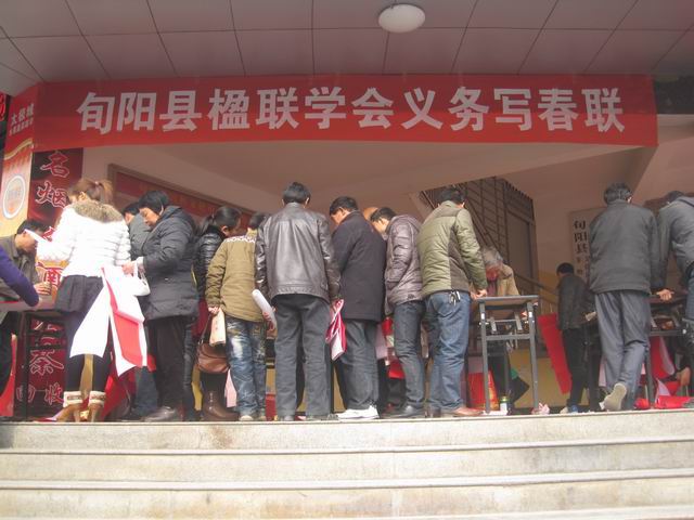 为了使全县人民过一个热闹、祥和、愉悦、快乐的春节,连日来,从腊月23日至28日,旬阳县楹联学会组织10余名会员,先后赶赴白柳、城关、赵湾等镇(社区),围绕县上开展的“同心文化”、“科技 教育、卫生三下乡”等活动,深入机关、学校、厂矿、企业,积极为干部职工群众义务写春联。在活动现场,前来领取楹联的人们络绎不绝。不少群众激动地说“现在,共产党对我们老百姓真好,看人家县上的同志,跑了这么远的了路,不仅义务写春联,还免费送给我们,我们要懂得怎样感恩,要用行动感谢共产党。”
