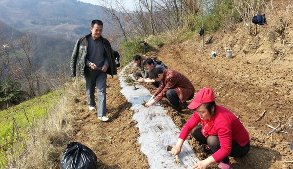 春阳暖人心,干部农户种茶忙。3月10日上午,久雨初晴,在赤岩镇连桥村,20多名农民手拿锄头、挖穴、栽苗、压土、覆膜、浇水…忙得不可开交。