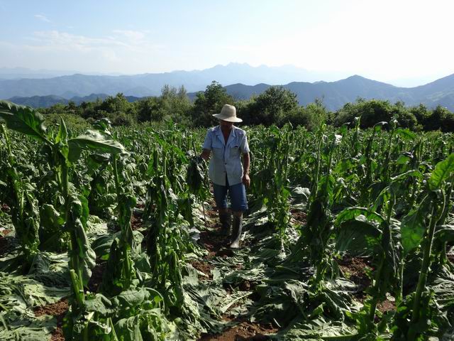 一场突如其来的天灾,使烟地里成片的烤烟被冰雹打得七零八落,有的烟叶被打断后铺在了烟沟里,有的烟叶被打折后垂挂在烟株上,受灾现场一片狼藉。在两村烟田里,大多数受灾烟农已开始清理自家田被打落的烟叶,受灾农户陈兴宏夫妇痛哭流涕地对前来看望灾害的镇干部说“我家有45亩烤烟被冰雹打烂,今年损失惨重”。此次灾害中,金盆村三组、竹园村一组共计有9户烟农的189亩烤烟被冰雹袭击遭受了绝收损失,其中烤烟大户陈兴宏投入烤烟生产成本达六万余元,预计收入20万余元,已成泡影。