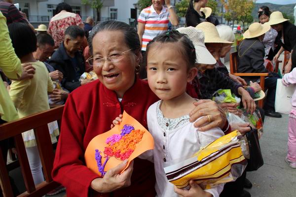 9月29日,孩子们为爷爷奶奶准备了重阳联欢会,活动在《小苹果》的音乐声中拉开了帷幕,合唱《没有共产党就没有新中国》,教师独舞《珊瑚颂》,诗歌朗诵《我爱我家》,舞蹈《魔法小达人》等,孩子们用他们纯真的笑声,动听的歌声,优美的舞姿为爷爷奶奶带来了节日的问候。《我为爷爷奶奶敲敲背捶捶腿》的歌声将活动推向了高潮,孩子们为爷爷奶奶敲背、揉肩、捶腿,还送上了自己亲手制作的小礼物和一些水果、面包等,幸福的笑容绽放在每位老人的脸上,也荡漾在孩子的心中。