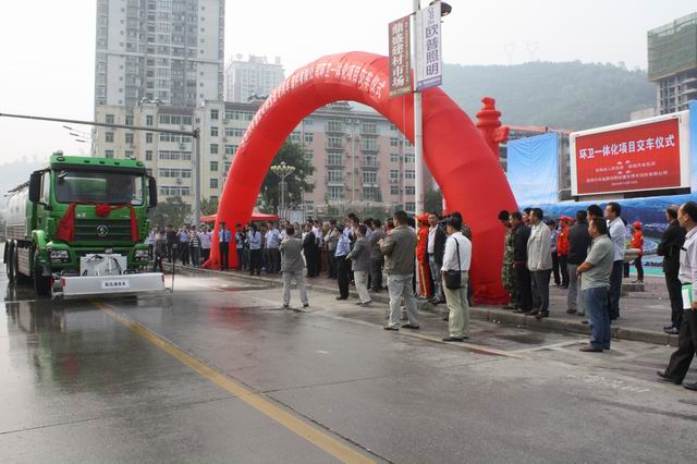 陕汽集团旬阳宝通环卫一体化项目是采用垃圾处理机械化、运输密封化、处理无害化的环保模式,创新设计多款数字化产品,实施综合保洁的环卫一体化解决方案。这次交接给我县的13台套新型环卫车包括2台高压清洗车、2辆钩臂车、4辆后装式压缩垃圾车和 5辆移动式垃圾压缩车。这些车辆的投入运营将全面提升我县城区环卫硬件装备水平、改善群众的生活环境。