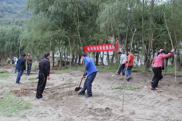 10月29日,由赵湾镇机关和赵湾社区党员、干部联合组成的赵湾镇志愿者服务队伍在旬河边干得热火朝天,为旬河边种上500余棵防风固沙、涵养水土的柳树。