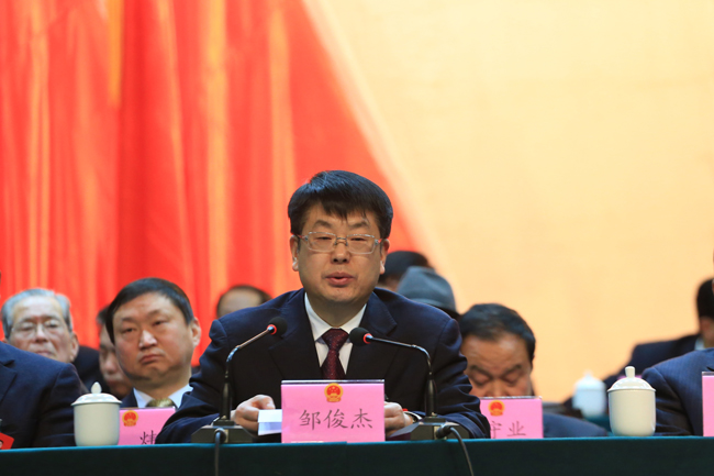 邹俊杰在讲话中指出,本次大会是一次民主团结、凝心聚力、求实奋进的大会。过去的一年,全县上下认真贯彻党的十八届三中、四中全会精神,紧紧围绕“打造升级版,提高贡献率;让总理放心,让人民满意”的主题和要求,积极践行党的群众路线,奋力加快经济社会发展,坚决反对“四风”、狠刹“五股歪风”,干部思想作风显著改进,经济发展稳中有进,生态环境更加优美,社会事业全面进步。他强调,2015年,是深入贯彻落实党的十八届四中全会精神、全面推进依法治国的开局之年。做好今年的各项工作,对促进县域经济社会持续健康发展,圆满完成“十二五”目标任务,为“十三五”奠定良好基础,都具有十分重要的意义。他要求,县人大及其常委会和全体人大代表要以改革精神和法治思维,认真履行职责,确保本次会议形成的决议不折不扣落到实处,力促转型升级,持续改善民生,推进民主法治,强化自身建设,坚持党的领导,不断开创人大工作的局面,为在新常态下开创县域经济社会发展新局面做出新的更大的贡献。