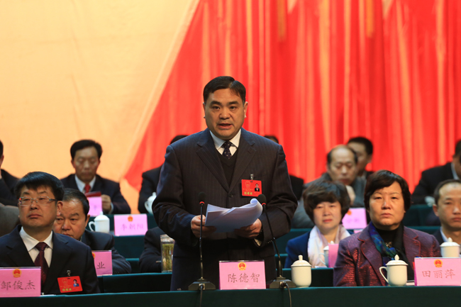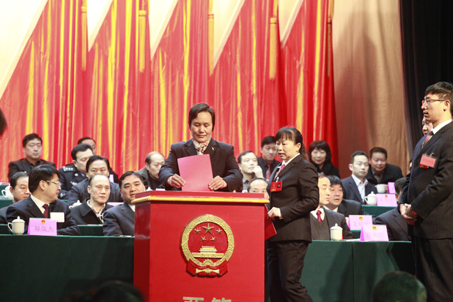 新当选的县长陈红星在大会上向人大代表作表态发言。