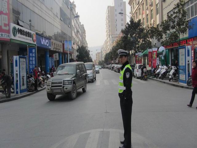 2月9日早7点30分,洞口岗亭、桥头十字、美华十字、河源转盘、建新十字、政府十字、新城十字、新华书店门前、商贸一巷、商贸四巷、康华园十字,覆盖了全县城区所有交通要道的十字路口,布满了所有执勤交警,白色的大檐帽,绿色的反光背心、矗立在密集的人群中显得格外醒目,对讲机里时不时传来同事间的指令,协调着整个县城车辆、人群的流动。受困于警力有限,每个岗位上的民警都在超负荷的运转,每天的站立时间远远地超过了8个小时,午饭、晚饭很多时候都是在岗位上泡面而成。年关将至大量的行人、货车、小车、摩托车等形成的混合交通在此交汇,让执勤民警苦不堪言。但是,我们民警深知肩上责任重大,三个路口8小时以上不间断指挥、疏导,形成了一条人工红绿灯,一一化解了大面积的拥堵,保障了群众的出行。特别是女民警在劝阻行人时,不停地喊话、解释、嗓子哑了都还在坚持,有小孩的民警也都顾不上小孩生病,依然矗立在自己的岗位上。从2月9日至2月18日(大年三十)的这十天时间里,这些场景每天都这样重复着,在这个合家团圆的日子里,这群人就凭着职业操守,守护着一方平安。