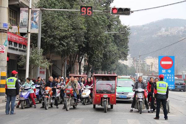 “麻烦请您等一下,现在是红灯,请停一停,谢谢!”头戴小红帽的党员志愿者不断地跟过往行人沟通,提醒大家遵守交通秩序,有序通过,确保安全。