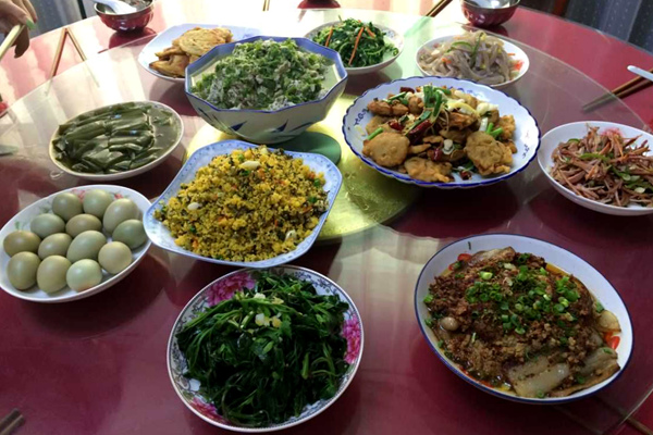 在感受了大自然的鬼斧神工之后,该行人继续寻找“金寨最会做美食的人”。在路人的引导下,他们来到了该镇最会做美食的刘姐家中。在刘姐的热情招待下,细嫩的野鸡蛋、香脆的莲菜盒子、清脆爽口的凉拌灰条和麻子菜、肥而不腻的豆腐乳蒸肉、香菇炖野鸡、白蒿豆腐还有最神奇的神仙凉粉等十几种美食新鲜出炉,“挑逗”着大家的眼球和味蕾。
