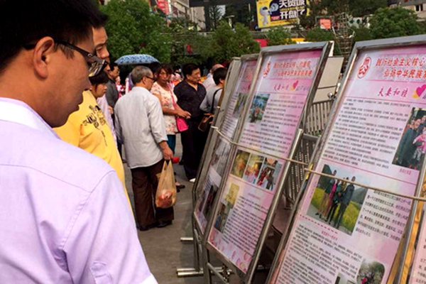 “这些图片好呀,让年轻媳妇好好看看,怎么孝敬老人…”红军镇丰积村大娘边看最美家庭展板,边抹着眼泪说。
