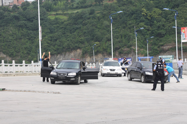 “各小组注意:接110通报,有一辆黑色无牌现代小轿车,车上有三名男子,可能携带毒品,从白柳镇张湾移民小区前往西安交易,请各小组按预案分工对可疑车辆检查。”演练一开始,“可疑车辆”在警车和便衣民警围堵下,进入警方控制区域,强制停车后,通过喊话的方式对嫌疑人进行控制并实施抓捕,民警立即对车辆进行检查。