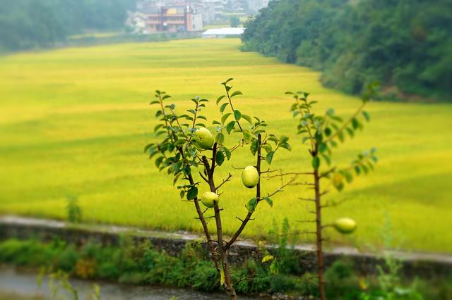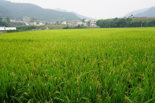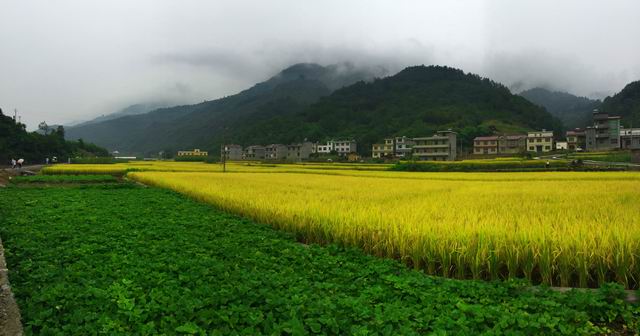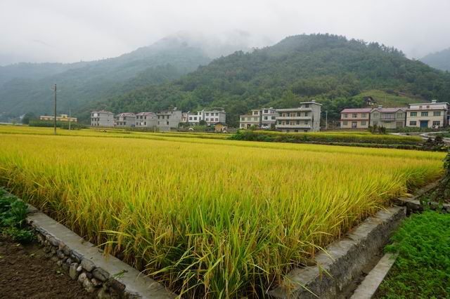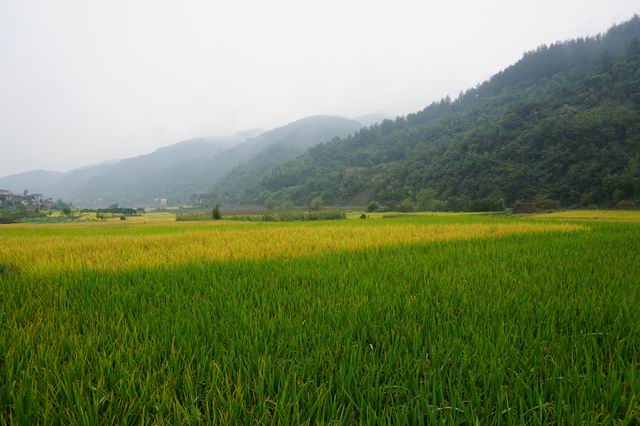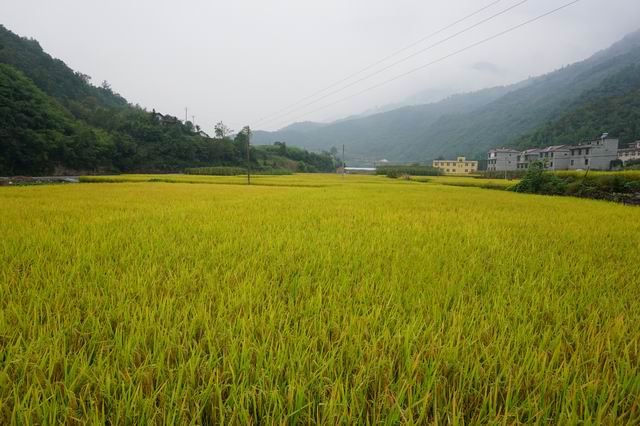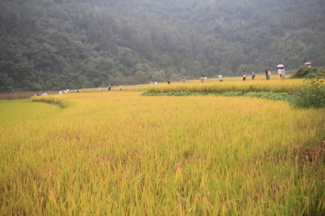 汽车顺着一条蜿蜒曲直的水泥路,映着细雨小景,峰回路转,沿着西岔河逆流而上,生活的节凑慢了起来。叠嶂滴翠,肥鸭戏水,炊烟应景,四目张望一梯梯、一片片金黄的稻田,收获之悦悠然心底。