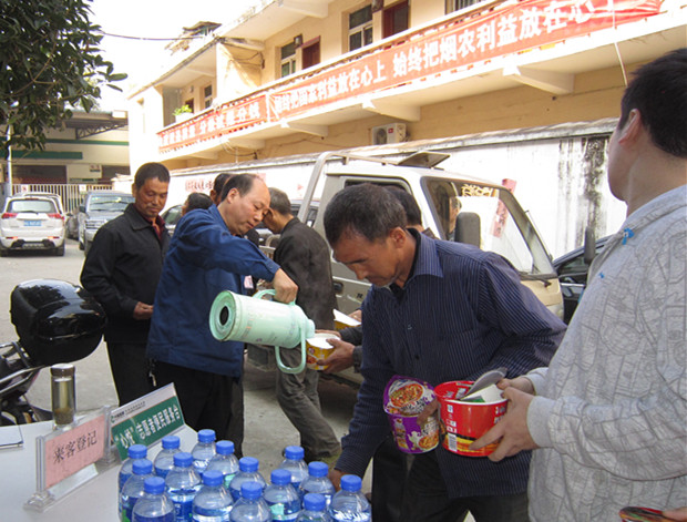 近日,在金寨烟站看到,一车车金灿灿的烟叶,整齐地摆放在金寨烟站收购库房的厂棚里,旬阳烟草专卖局(分公司)“心悦”志愿者服务队人员,提着开水,向烟农发放方便面、矿泉水,买烟烟农端着泡好了的方便面,耐心的听取工作人员讲解服务范畴,收购流程规范,秩序井然。