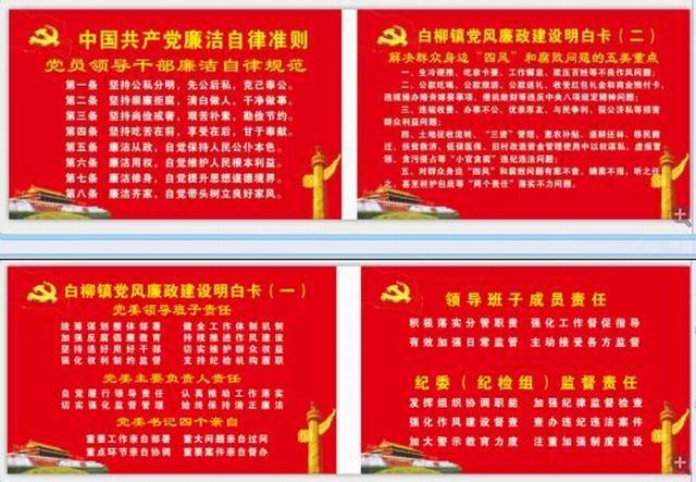 白柳镇全面推行党风廉政建设“明白卡”,迅速掀起学习、贯彻和落实“两个责任”热潮。面对党风廉政建设新常态、新要求,白柳镇立足基层党风廉政建设工作实际,将党风廉政建设党委主体责任、纪委监督责任、解决群众身边“四风”和腐败问题五项重点、新的廉政准则等内容制作成“卡”,印发至全镇党员干部,使全体党员干部尤其是领导干部将“两个责任”要求入手、入耳、入脑、入心,随时随地抓好对照落实,进一步强化全镇落实党风廉政建设“两个责任”力度,助推解决群众身边“四风”和腐败问题。