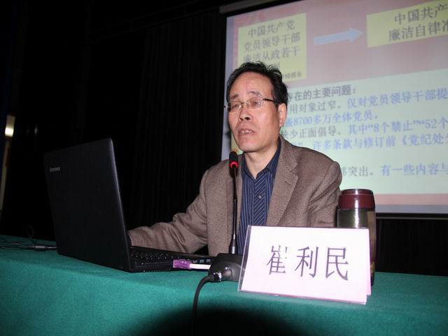 省纪委宣传部部长崔利民在讲座上为党员干部做了题为《深入学习贯彻<准则>和<条例>,把党规党纪刻印在心落实于行》的专题辅导。他从全面从严,依规治党,把党纪党规的笼子扎得更紧;立根固本,修枝剪叶,做到道德“高线”举起来;言有所戒,行有所止,做到纪律“底线”不失守;扛起责任,践之于行,推动《准则》和《条例》落地生根四个方面作了全面深刻的阐述。整场报告精彩生动,深入浅出、通俗易懂,让大家深受启发和教育,有助于进一步学习理解《准则》和《条例》的主旨。