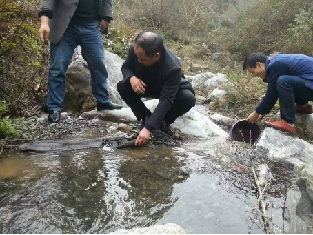 吕河镇任家湾村、秦家塔等5个贫困村属较为偏远的山区,从吕河镇政府驻地开车去各村活动室,最近的也需要1个多小时,而寻找合适水源就必须深入无路可走的深山中。这一路走来确实很辛苦,衣服被荆棘挂烂,皮鞋张开大口,但这并不影响一行同志们对寻找合适水源的信心。终于,经过3个多小时的跋涉,在人迹罕至的一处幽静,寻得一股清泉。工作人员按规定对水源进行了采样,等待送检合格后就能确定为人饮工程水源。