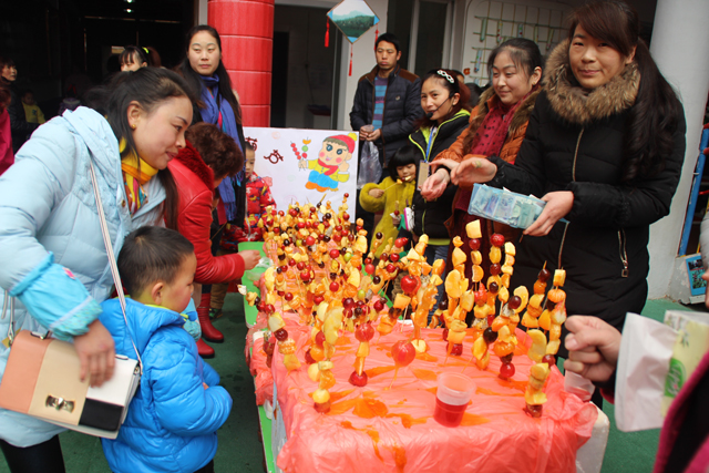 最后,隆重上演的是各班的义卖活动,幼儿园院子、班级活动室在大家的共同协作下,俨然一个大型跳蚤市场瞬间搭建好了,孩子绘画作品、亲子手工作品、自制食品DIY(紫菜卷、煮玉米、蒸发糕、蒸红薯、热饮、糖果、糖葫芦、烙饼子)琳琅满目,买卖招牌、摊点设备一应俱全。幼儿在家长的帮助下扮演小商人和购物者,各班丰富的商品吸引了孩子们竞相抢购,他们用积攒的零花钱购买了自己喜爱的物品,在讨价还价的过程中锻炼理财与沟通分享的能力,体验义卖的乐趣,整个过程乐趣无穷,让人流连忘返。