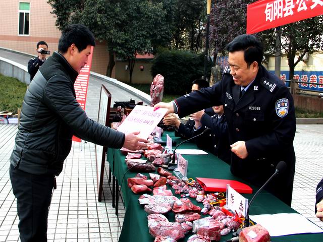 2月18日上午,旬阳县公安局机关院内,近百名公安战士整齐列队,严阵以待,随着一声令下,“1.27”特大鸡血石被盗案发还仪式正式开始,曾经被盗的404块、市价约300万元的鸡血石原石、把件和摆件等名贵石头正式归还失主。
