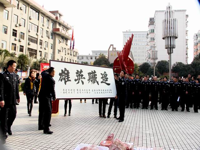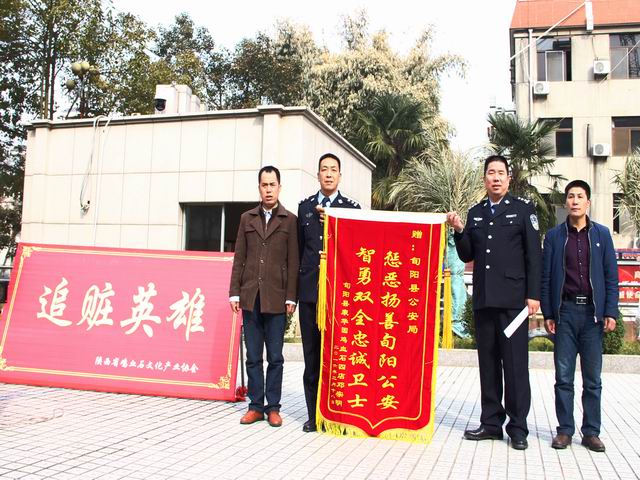 上午10时许,失主邓宗明带着仪仗队在一阵欢快的锣鼓声和鞭炮声中将上书“追赃英雄”的大匾额和“惩恶扬善旬阳公安 智勇双全忠诚卫士”的锦旗敬赠给英勇的公安干警 ,数十名公安干警、陕西省鸡血石协会代表和社会各界群众共同见证了这一激动人心的一刻。