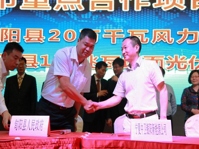 在5月12日下午安康国家高新区商务环境说明会暨全市重点合作项目签约仪式上,我县上市团签约20万千瓦风力发电和150兆瓦地面光伏发电两个项目,县上领导陈红星、程海林出席签约仪式。