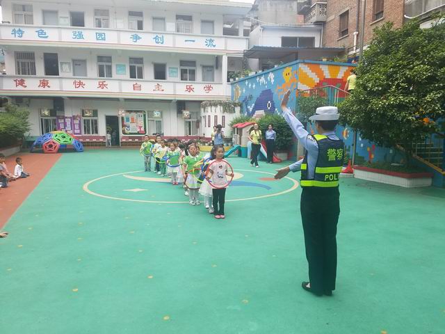 民警和幼儿教师一同教会了小朋友们交通安全平安行的儿歌,用儿歌增强小朋友对交通安全尝试的掌握和记忆。