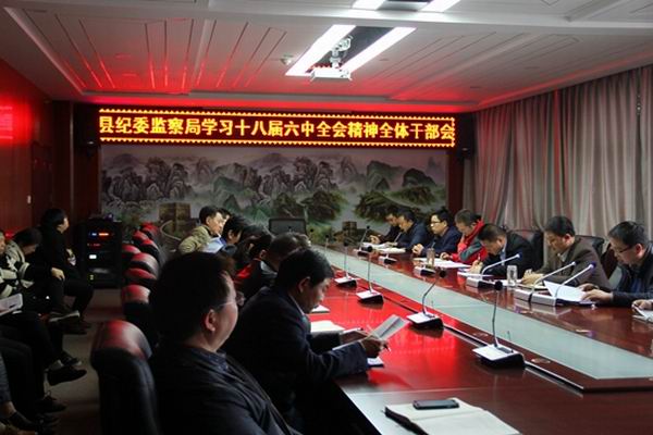 10月28日,县委常委、纪委书记付波组织召开县纪委监察局全体干部会议,传达党的十八届六中全会精神,原原本本学习了全会公报。全体干部一致认为,公报思想深刻、内涵丰富,再次表明了以习近平同志为核心的党中央继续推进全面从严治党,努力营造风清气正的政治生态,不断开创中国特色社会主义事业新局面的坚定信心和决心。