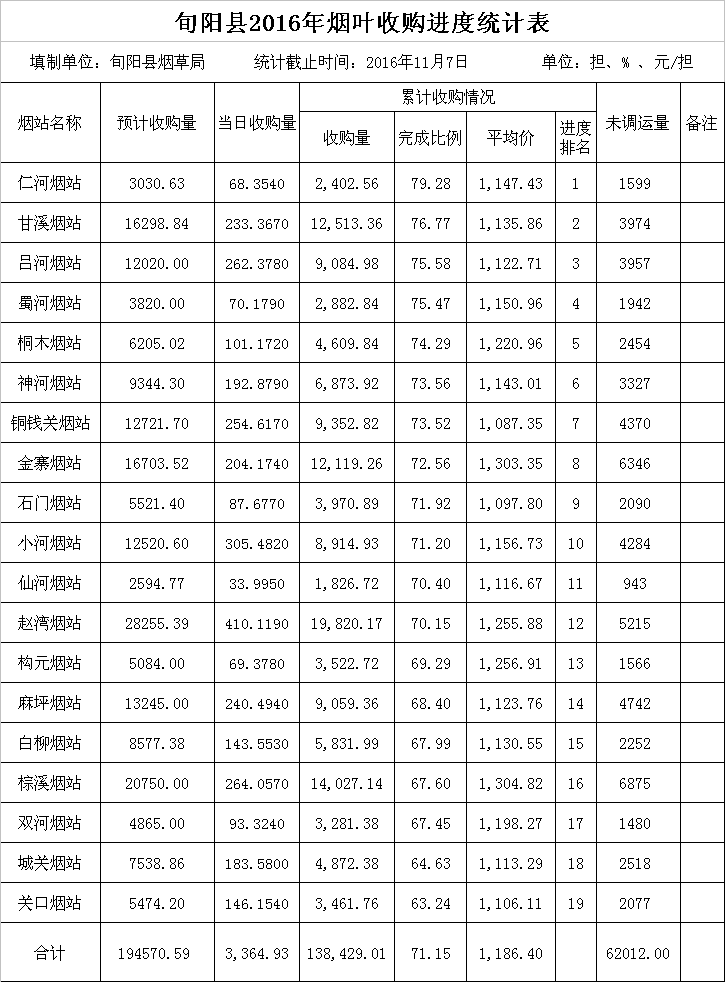 旬阳县2016年烟叶收购进度表(11.7)