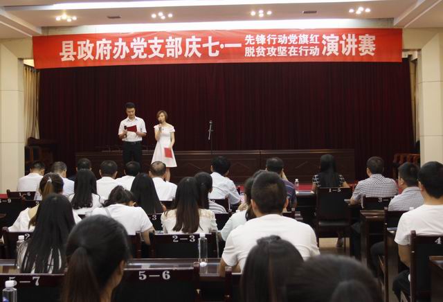为庆祝建党96周年,深入推进“两学一做”学习教育,积极践行“先锋行动党旗红”主题实践活动,6月29日,县政府办组织举行“先锋行动党旗红 脱贫攻坚在行动”为主题的庆“七一”演讲比赛。县委常委仵红兵,副县长王拥军、张松文、卜凯翔出席本次活动并为获奖选手颁奖。