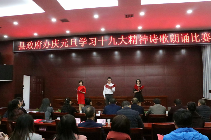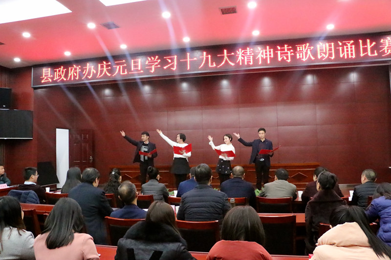 12月28日,县政府办党支部举行庆元旦学习党的十九大精神诗歌朗诵比赛。县委常委、常务副县长邹伟,副县长卜凯翔出席比赛活动,并为获奖选手颁奖。