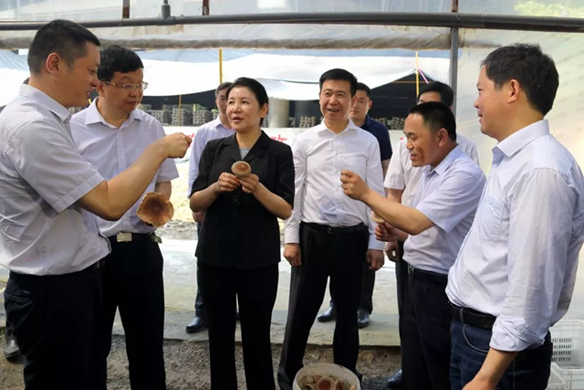 △旬阳县县长陈红星向省委副书记贺荣,省人大常委会副主任、安康市委书记郭青,省政协副主席、省扶贫办主任王卫华一行介绍“党支部+X+贫困户”脱贫模式