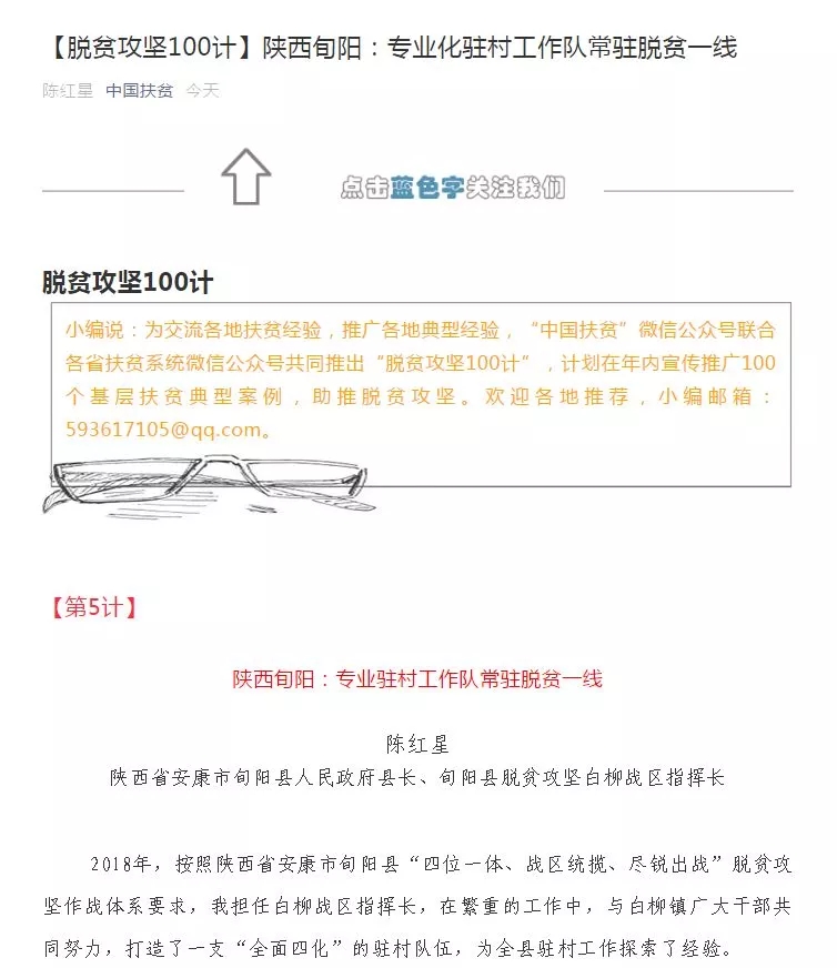8月26日,县长陈红星发表的署名文章《旬阳:专业化驻村工作队常驻脱贫一线》被作为脱贫攻坚100计之第5计在“中国扶贫”微信公众号发表,向全国推广旬阳经验。