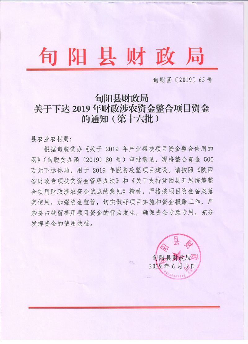 旬阳县财政局关于下达2019年财政涉农资金整合项目资金的通知(第十六批)的公告