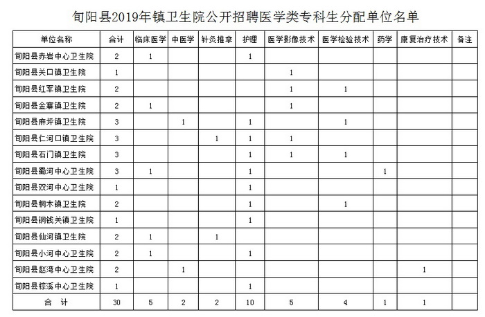附:旬阳县2019年镇卫生院公开招聘医学类专科生分配单位名单