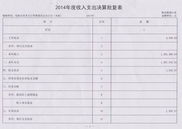 上年度结余5394.65元,2014年度一般预算财政拨款收入1283280.64元,一般预算财政拨款支出1287316.02元,一般预算财政拨款年末结余1359.27元(其中:项目支出结余0元)。