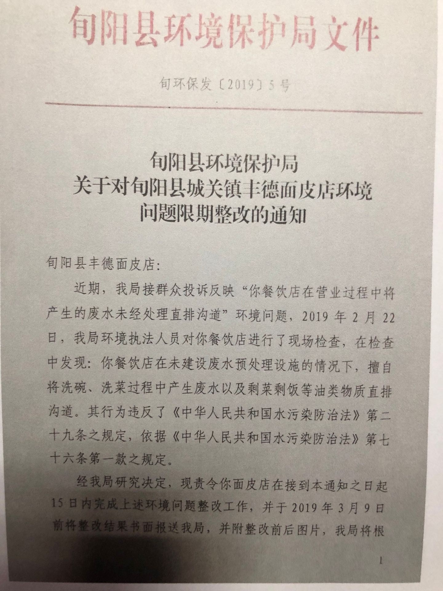 旬阳县丰德面皮店环境违法行为行政处罚信息