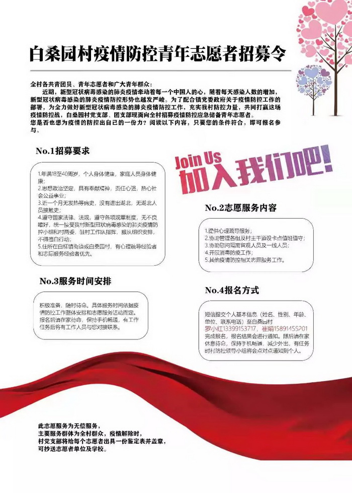 近期,新型冠状病毒感染的肺炎疫情蔓延以来,为配合镇党委政府疫情防控工作,充实村级力量,白桑园村党支部、团支部面向全村招募疫情防控应急储备青年志愿者。2月2日,一条招募青年志愿者的宣传海报在白桑园村工作交流群中迅速传开。