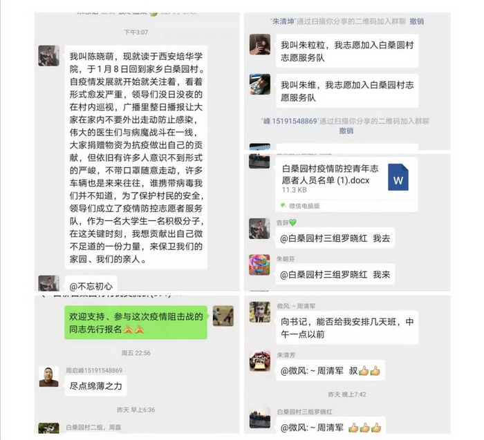 “针对目前新型冠状病毒感染的肺炎疫情,作为一名大学生,一名积极分子,在这个关键时刻,我想贡献自己微不足道的力量来保卫我们的家园,我们的亲人。”就读于西安培华学院的陈晓萌在白桑园村交流群中的庄严承诺被纷纷点赞,同时,也带动了越来越多的党员群众加入志愿者行列。