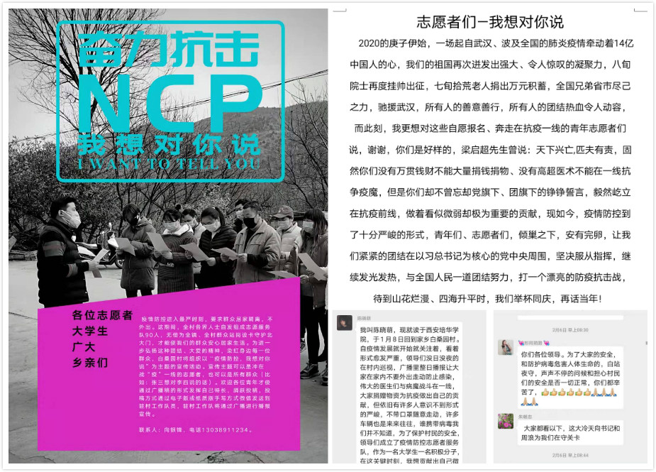 针对群众心理疏导需要,白桑园村组织开展了“疫情防控,我想对你说”主题活动,村民发送短信、微信,志愿者们收集组稿,再用广播播报的方式讲述战“疫”一线故事,传递群众间的亲请问候和互动交流,村民又觉得新奇,又觉得有必要,纷纷参与进来。