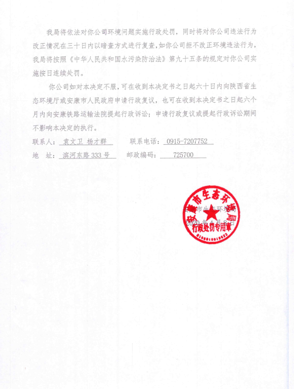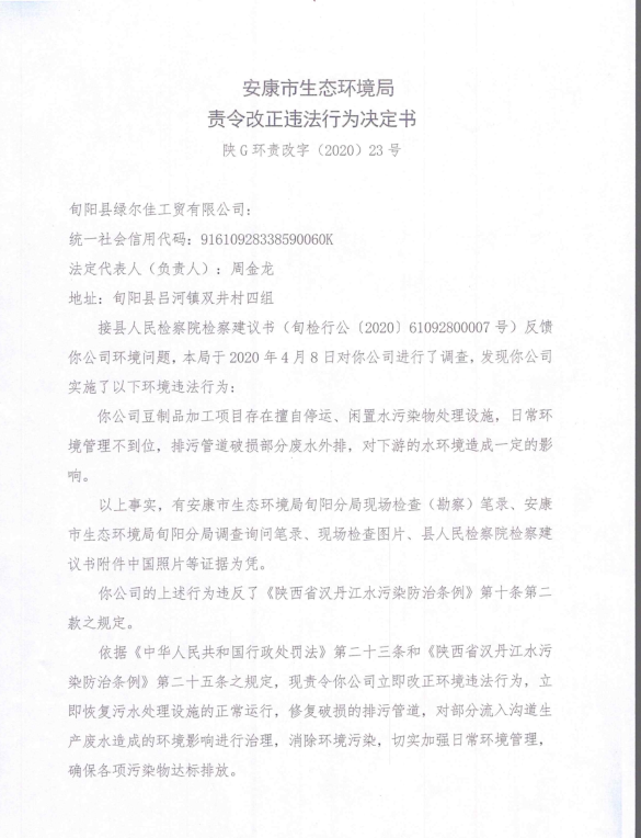 安康市生态环境局责令改正违法行为决定书 陕G环责改字(2020)23号