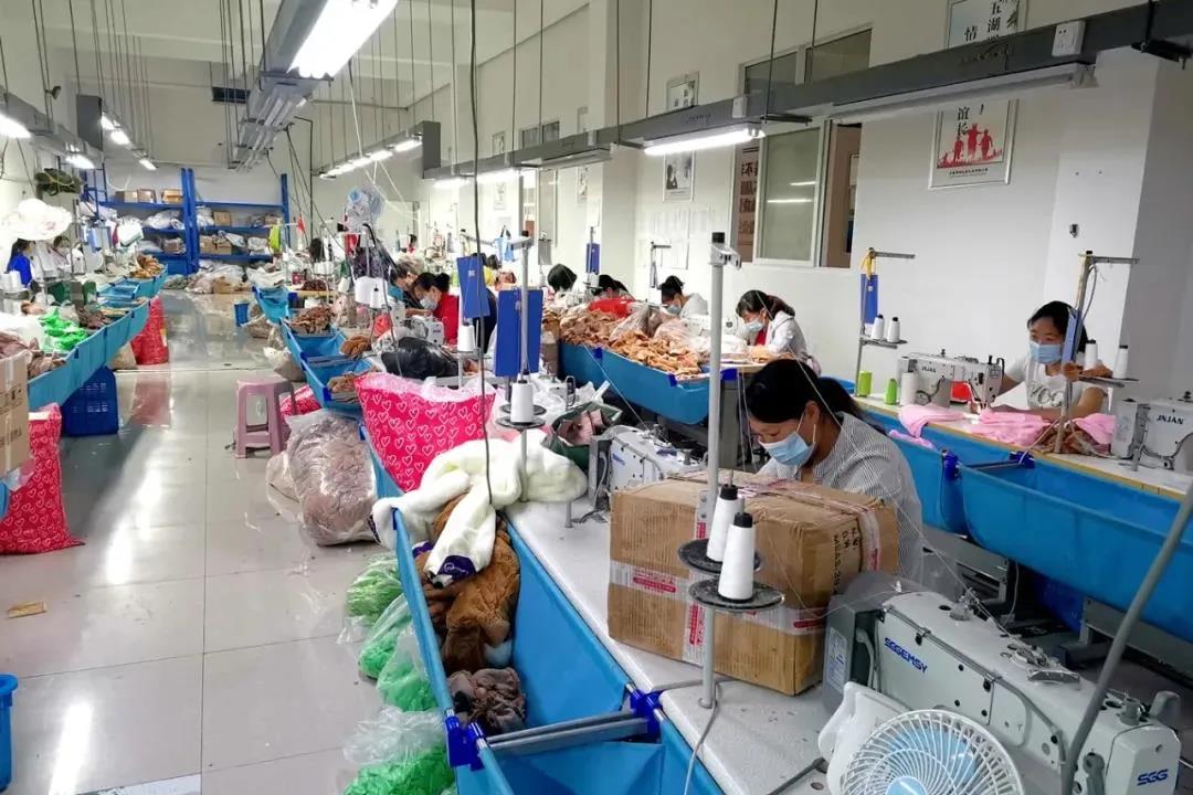 走进位于吕河镇汉水佳苑安置小区的睿峰玩具礼品有限公司生产车间,上百台机器咔嗒作响,百余名工人忙着印花、裁剪、充棉、缝合……