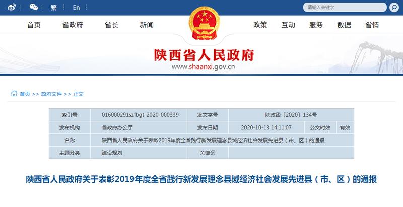 通报指出,2019年,全省县域经济整体运行平稳,质效提升保持良好态势,兴县强县建设迈出新步伐,经综合考评,并结合党风廉政建设、环境保护、节能降耗、安全生产等方面实际情况,府谷县、靖边县、吴起县、黄陵县、凤翔县、定边县、旬阳县、彬州市、勉县、岐山县成为2019年度全省践行新发展理念县域经济社会发展“十强县”;雁塔区、碑林区、榆阳区、莲湖区、新城区为2019年度“五强区”;柞水县、富县、佛坪县、泾阳县、宜君县、紫阳县、西乡县、丹凤县、白河县、洋县为2019年度“争先进位县”;耀州区、商州区、王益区、金台区、印台区为2019年度“争先进位区”;蒲城县、眉县、周至县、富平县、大荔县为2019年度“现代农业强县”;麟游县、志丹县、扶风县、平利县、千阳县为2019年度“新型工业强县”;太白县、山阳县、宁强县、商南县、留坝县为2019年度“生态建设强县”。省政府将按照有关规定,对这些县(市、区)给予奖励。