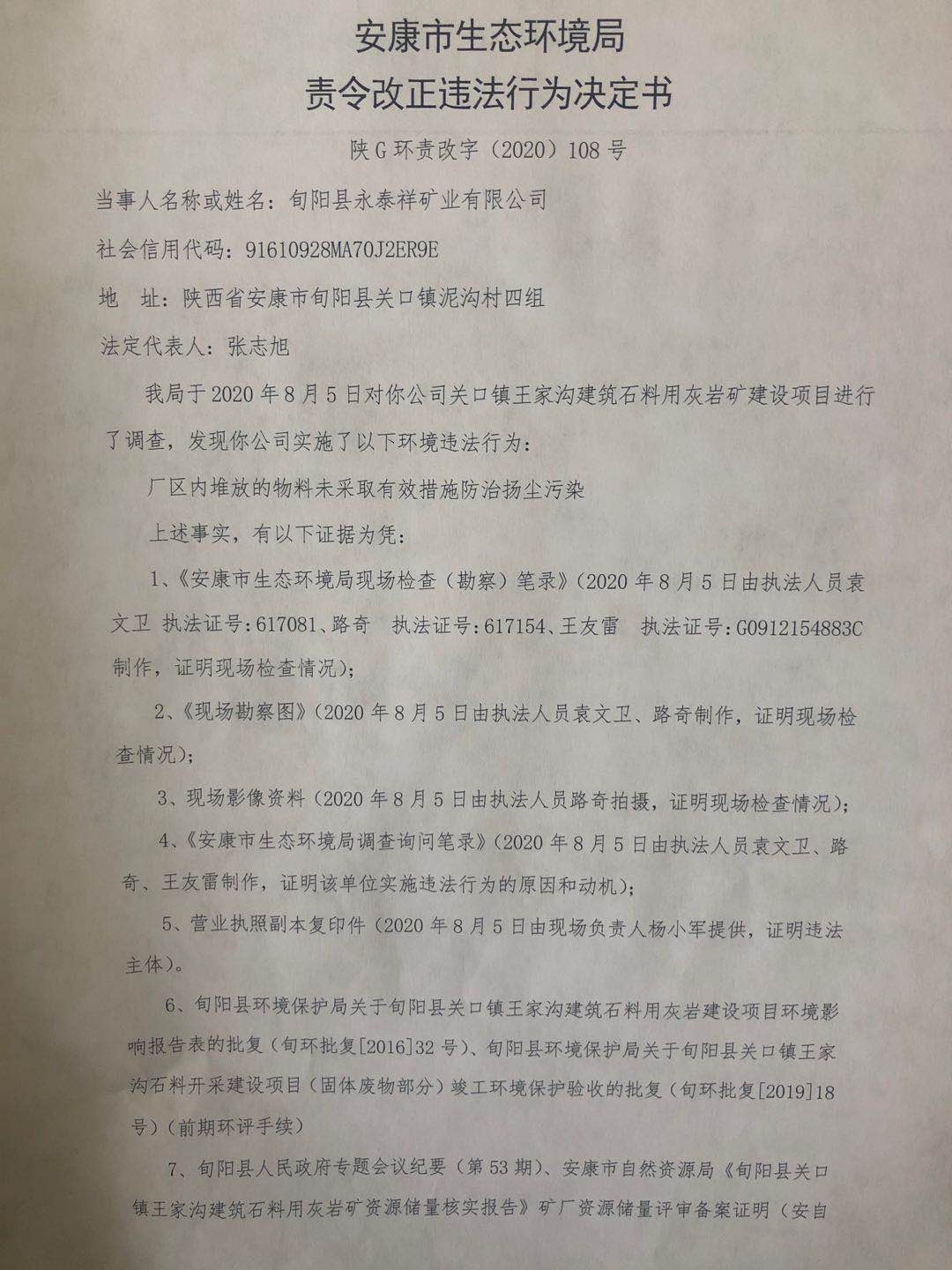 安康市生态环境局责令改正违法行为决定书 陕G环责改字【2020】108号