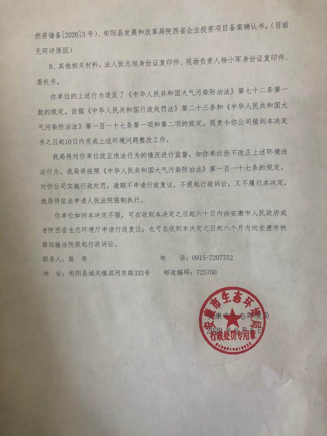 安康市生态环境局行政处罚决定书 陕G环罚【2020】87号